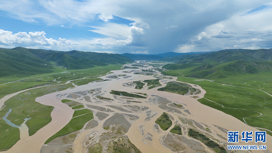 圖為在青海省果洛藏族自治州達(dá)日縣境內(nèi)拍攝的黃河辮狀水系(無人機全景照片)。新華網(wǎng) 宋忠勇 攝