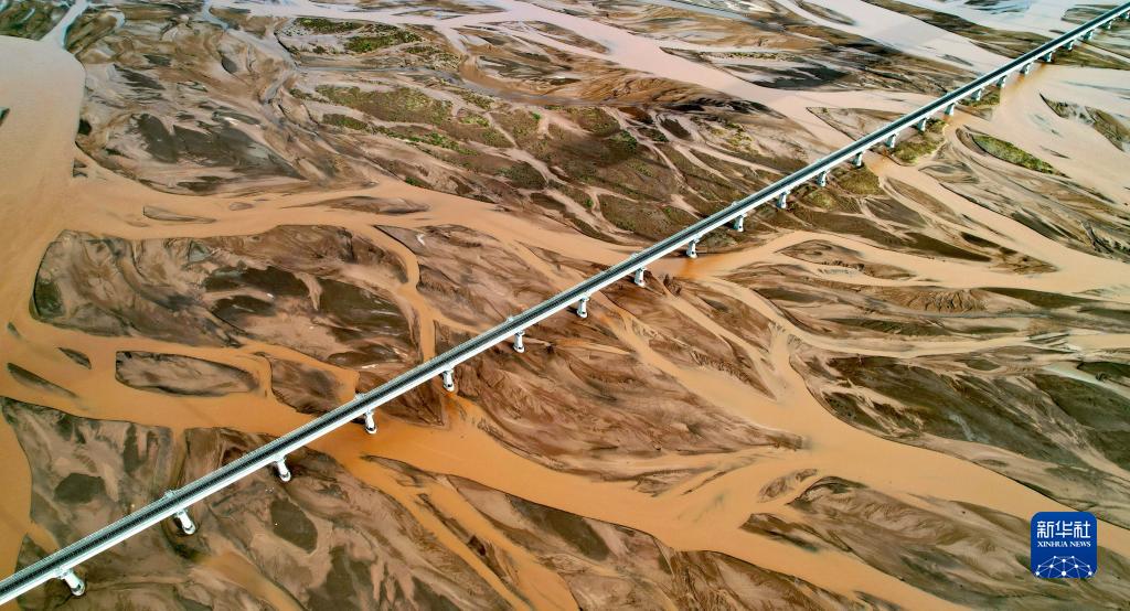 青藏鐵路跨過(guò)尕爾曲的辮狀河道(7月27日攝,無(wú)人機(jī)照片)。新華社記者 劉詩(shī)平 攝