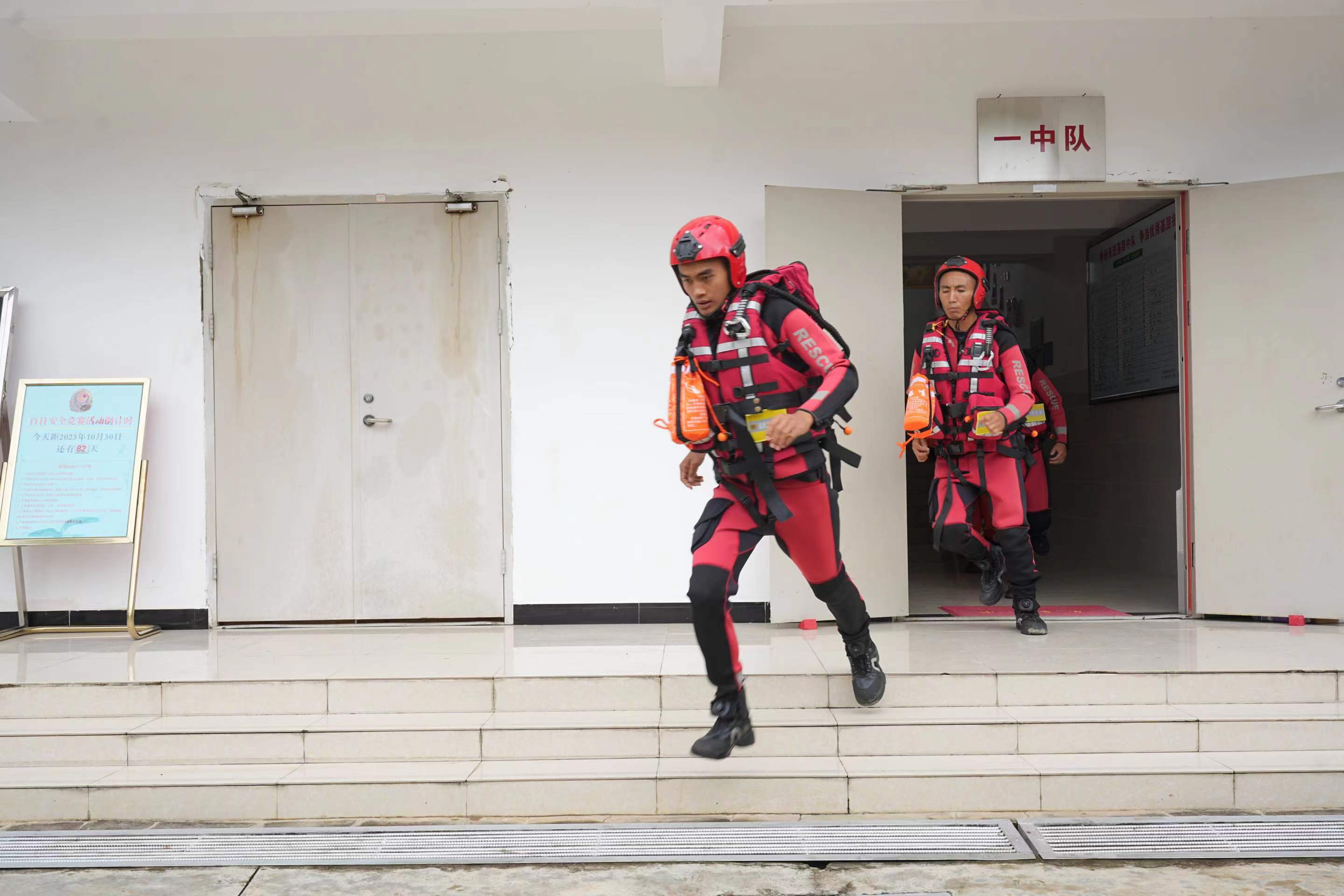 隨著警報聲響起,參戰(zhàn)隊員迅速更換戰(zhàn)斗著裝,攜帶戰(zhàn)斗裝具集結(jié)。到達(dá)模擬任務(wù)區(qū)域后,隊伍針對現(xiàn)場實際情況制定救援計劃,奔赴救援現(xiàn)場開展救援行動。圖為演練現(xiàn)場。