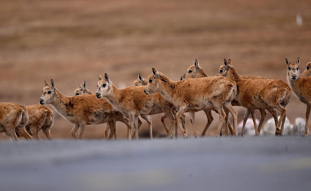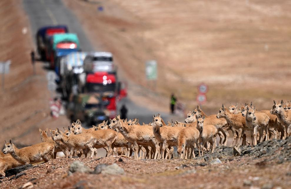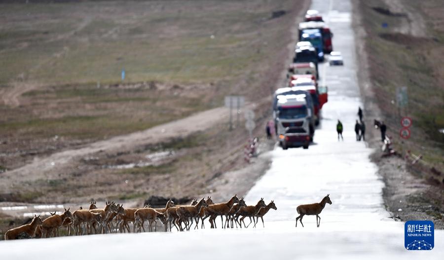 一群待產(chǎn)雌性藏羚羊在通過青藏公路前往可可西里卓乃湖產(chǎn)仔(5月28日攝)。新華社記者 張宏祥 攝