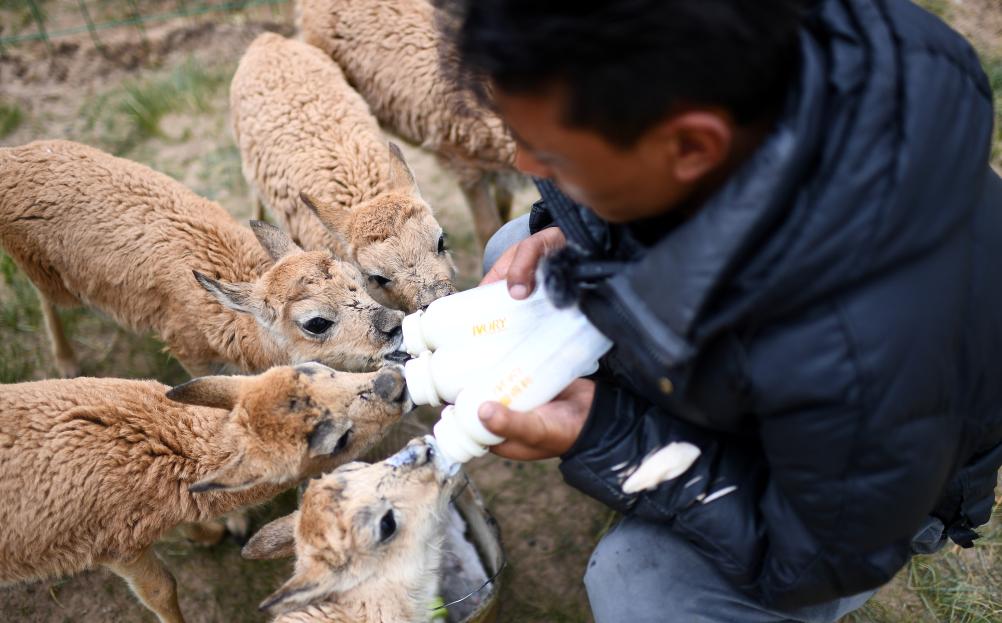 可可西里管理處索南達(dá)杰保護(hù)站隊員才仁多杰在給被救助的藏羚羊幼仔喂奶(7月28日攝)。新華社記者 張宏祥 攝
