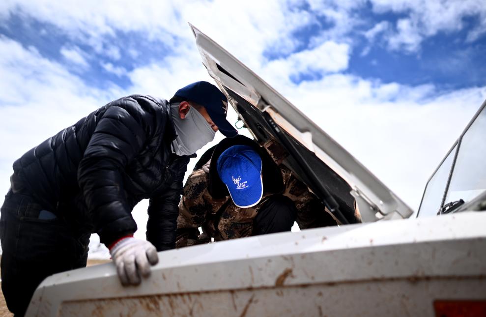 在前往卓乃湖保護(hù)站的途中,可可西里管理處卓乃湖保護(hù)站隊員才索加(左)和隊友在維修出現(xiàn)故障的車輛(6月16日攝)。新華社記者 張宏祥 攝