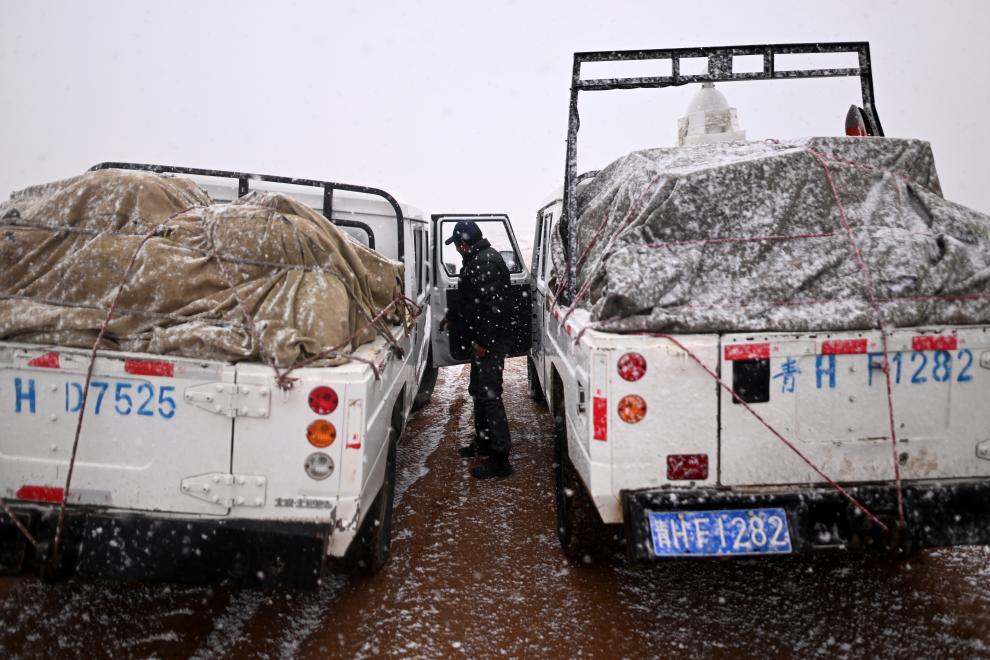 可可西里管理處卓乃湖保護(hù)站隊員在前往卓乃湖保護(hù)站途中遭遇大雪(6月16日攝)。新華社記者 張宏祥 攝