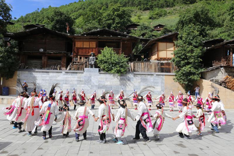 8月14日,維西縣葉枝鎮(zhèn)同樂村村民身著盛裝,跳起傈僳族特色民間歌舞阿尺目刮,歡迎遠道而來的客人。