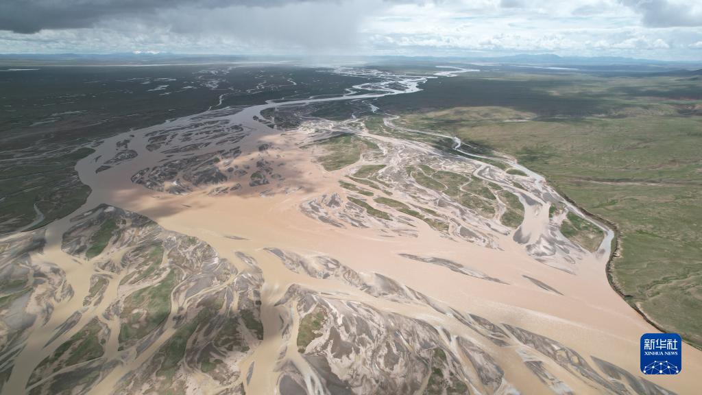 沱沱河與當曲匯合處的囊極巴隴,辮狀河道寬度超過3千米(7月26日攝,無人機照片)。 新華社記者 劉詩平 攝