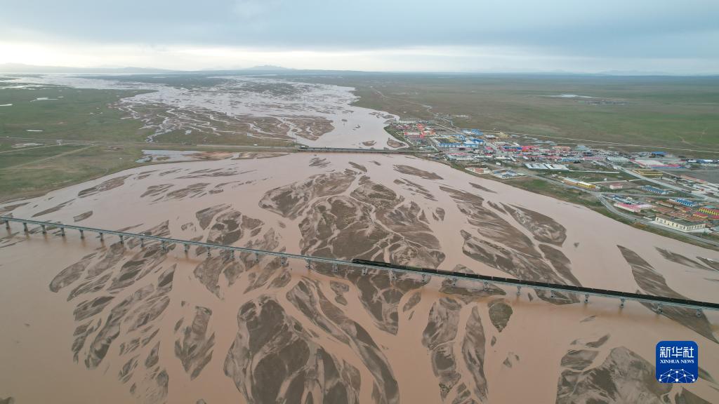 青藏鐵路列車通過楚瑪爾河(7月29日攝,無人機照片)。 新華社記者 劉詩平 攝