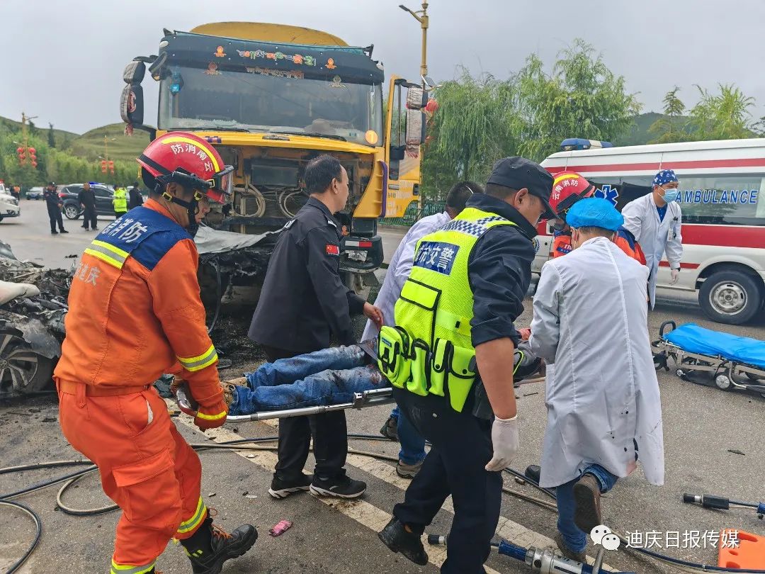 接到調(diào)令后,香格里拉消防救援站立即出動(dòng)2車13人前往處置,到達(dá)現(xiàn)場(chǎng)后,發(fā)現(xiàn)一輛小轎車與一輛貨車相撞,轎車嚴(yán)重受損變形,車內(nèi)安全氣囊已彈出,副駕駛位被困人員頭部、腿部多處受傷無法動(dòng)彈,意識(shí)模糊,有嚴(yán)重生命危險(xiǎn)。