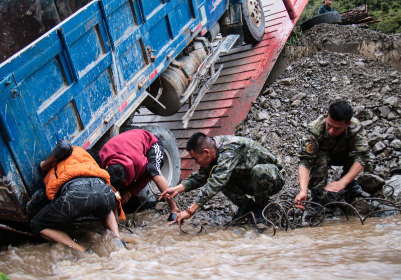 “同志,不要怕,我們是武警官兵,我們先給你處理傷口?!?甕云飛一邊安撫受傷群眾的情緒,一邊為他消毒止血、包扎傷口。后經(jīng)檢查,該群眾除了頭部有輕微皮外傷外,全身并無(wú)大礙。之后,中隊(duì)官兵又和當(dāng)?shù)厝罕娨黄鹜度胲囕v緊急救援,經(jīng)過(guò)幾個(gè)小時(shí)的努力,大家齊心協(xié)力將貨車拖至安全地帶。