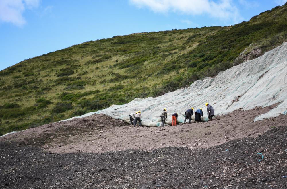 在四川省阿壩藏族羌族自治州若爾蓋縣達扎寺鎮(zhèn)多瑪村廢棄礦山治理點,工人們正在邊坡上鋪“椰絲毯”。新華社記者 王曦 攝