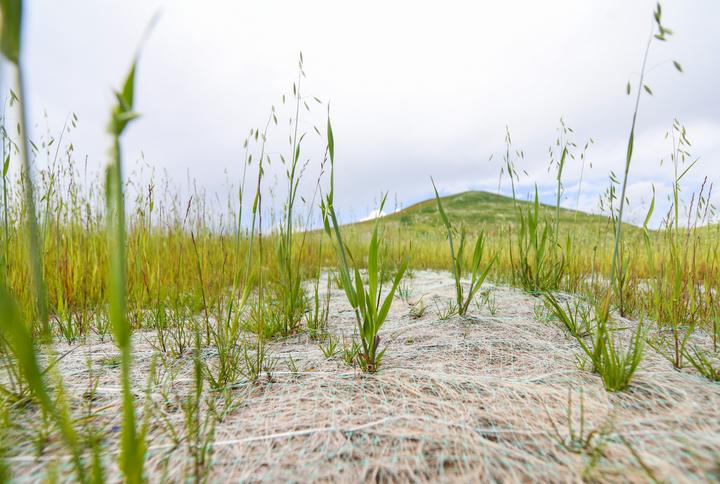 在若爾蓋縣唐克鎮(zhèn)嘎爾瑪村,這里的草原生態(tài)修復(fù)項目已完成近三個月。目之所及,蓋上“椰絲毯”的坡面,與遼闊的若爾蓋大草原融為一體。披堿草、老芒麥、高冰草和黑麥草從“椰絲毯”織成的小方格中破土而出,最高已近半米。