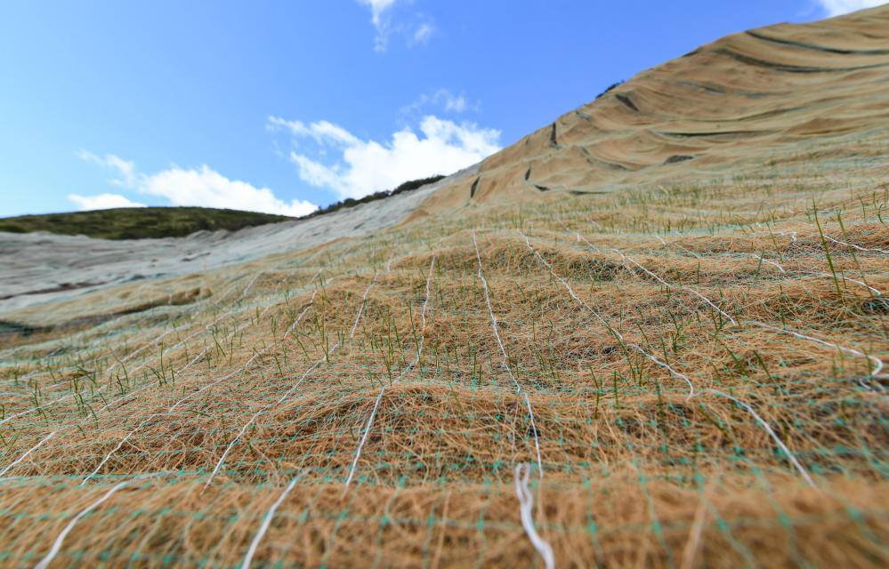 這是在四川省阿壩藏族羌族自治州若爾蓋縣達扎寺鎮(zhèn)多瑪村廢棄礦山治理點拍攝的“椰絲毯”。新華社記者 王曦 攝