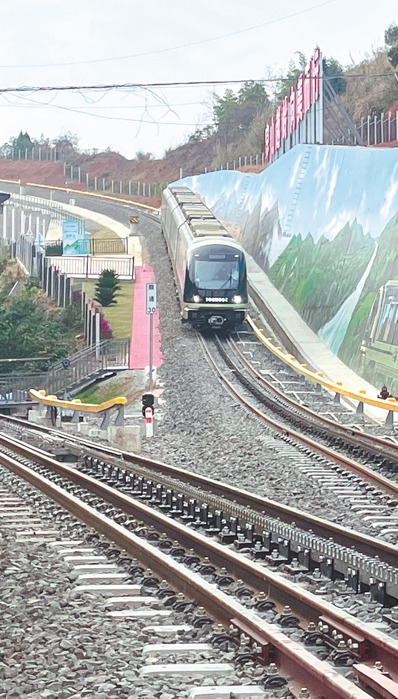 線路正線長度123.2公里,設(shè)計(jì)時(shí)速120公里,線路絕大部分路段為高架橋或隧道,橋隧占比達(dá)到了98.3%,全程“上天入地”、翻山越嶺。