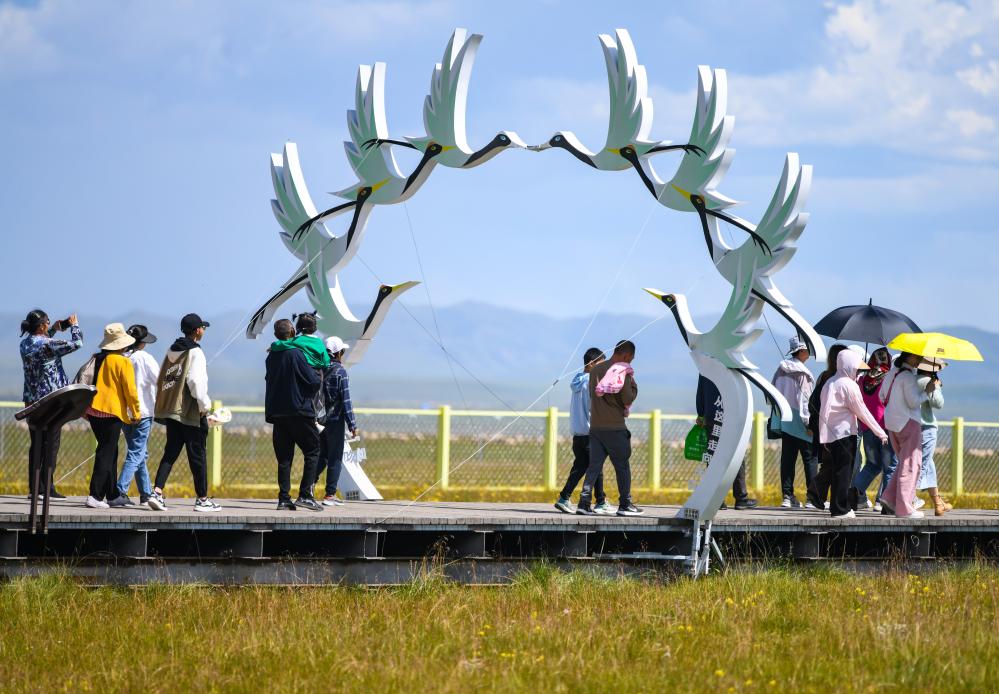 圖為游客在四川省阿壩州若爾蓋縣花湖景區(qū)觀(guān)光。新華社記者王曦 攝