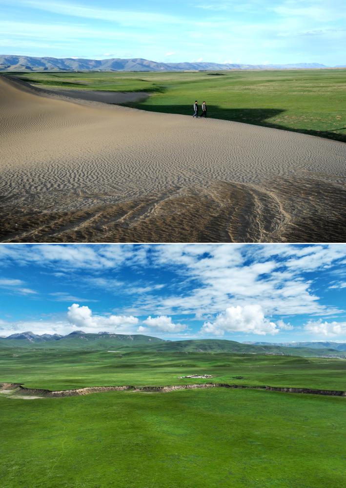 拼版照片:上圖為2011年6月9日,兩名技術(shù)人員在甘南藏族自治州瑪曲縣歐拉鄉(xiāng)歐強(qiáng)村查看草場(chǎng)沙化退化情況,這里已經(jīng)成為當(dāng)時(shí)瑪曲草原沙化最為嚴(yán)重的草場(chǎng)之一(新華社記者 聶建江 攝);下圖為2023年7月6日在甘南藏族自治州瑪曲縣歐拉鎮(zhèn)歐強(qiáng)村境內(nèi)拍攝的經(jīng)過治理修復(fù)的草原(新華社記者 陳斌 攝)。