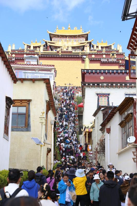 擁有著“小布達(dá)拉宮”和“藏族藝術(shù)博物館”之稱(chēng)的噶丹·松贊林寺人氣高漲,不少游客身著藏民族服飾欣喜地在景區(qū)寺院的金頂、黃墻下合影留念。景區(qū)外車(chē)水馬龍,停車(chē)場(chǎng)及公路沿線兩側(cè)停滿了來(lái)自全國(guó)各地的自駕游車(chē)輛,交警及景區(qū)工作人員井然有序的指揮著交通。景區(qū)內(nèi),游客源源不斷,在上車(chē)點(diǎn)排起了長(zhǎng)隊(duì),工作人員忙碌地指引著游客按秩序檢票上車(chē),“人實(shí)在太多了,假期以來(lái)從早上7點(diǎn)至晚上7點(diǎn)半都有游客進(jìn)出,19輛擺渡車(chē)都在不停運(yùn)行。”一位景區(qū)工作人員告訴記者。