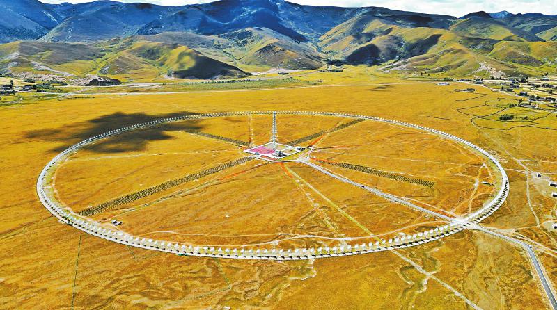飛機(jī)從稻城亞丁機(jī)場起飛,右側(cè)舷窗外的地面隱現(xiàn)一個小圓點(diǎn),因為造型特殊,當(dāng)?shù)厝朔Q“千眼天珠”。小圓點(diǎn)其實(shí)一點(diǎn)也不“小”——在海拔3820米的四川省甘孜州稻城縣噶通鎮(zhèn),313部直徑6米的天線,均勻地分布在直徑1公里的圓環(huán)上。它的正式名字叫圓環(huán)陣太陽射電成像望遠(yuǎn)鏡(下稱“圓環(huán)陣”),是國家重大科技基礎(chǔ)設(shè)施空間環(huán)境地基綜合監(jiān)測網(wǎng)(子午工程二期)的標(biāo)志性設(shè)備之一,也是目前已建成的全球規(guī)模最大的綜合孔徑射電望遠(yuǎn)鏡。其任務(wù)主要是對太陽和日地空間傳播鏈條進(jìn)行高質(zhì)量監(jiān)測,監(jiān)測太陽“打噴嚏”。