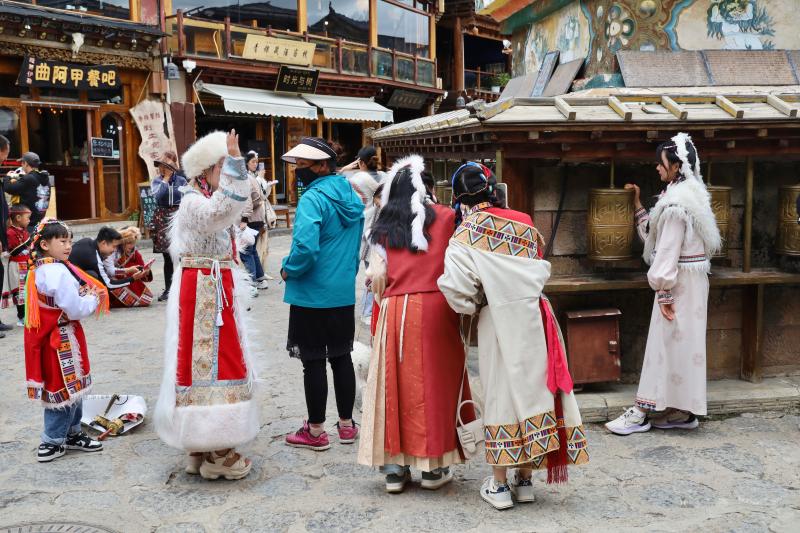 長假期間,獨(dú)克宗古城又掀起旅拍熱。走在獨(dú)克宗古城里,隨處可見身著藏族服飾、妝容精致的俊男靚女。“一梵攝影”店內(nèi),選服飾、選配飾、做妝造......來來往往的顧客絡(luò)繹不絕,“最近每天服務(wù)單數(shù)在四五十單左右,是長假之前的一倍多?!币昏髷z影的負(fù)責(zé)人說道。經(jīng)過化妝造型,游客們即刻變身美麗帥氣的卓瑪扎西,獨(dú)具民族特色的造型,配以古城的美景,深受游客的喜愛,大家紛紛以旅拍的方式給自己在旅途中留下一份美好的回憶。
