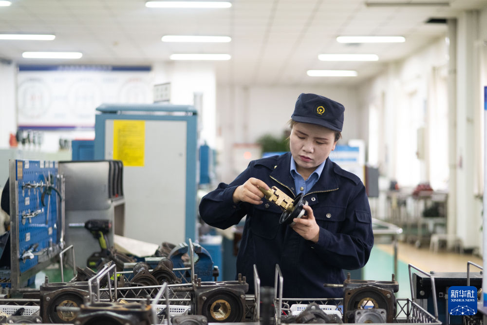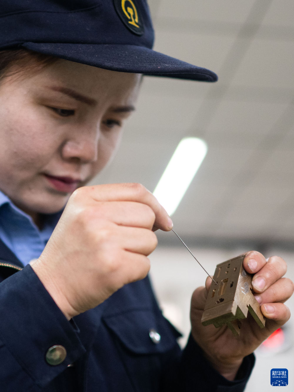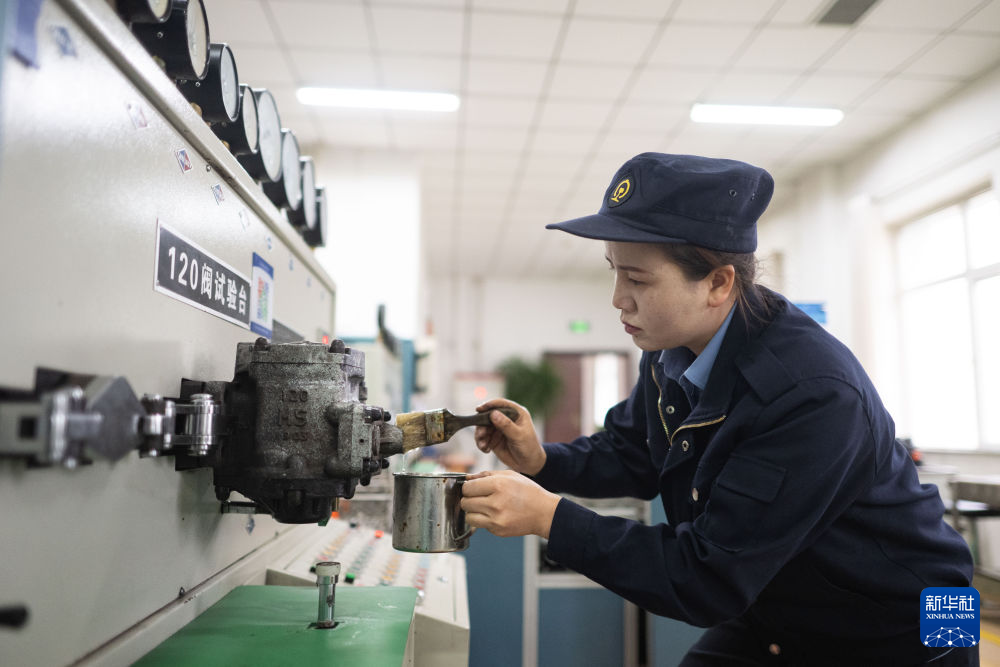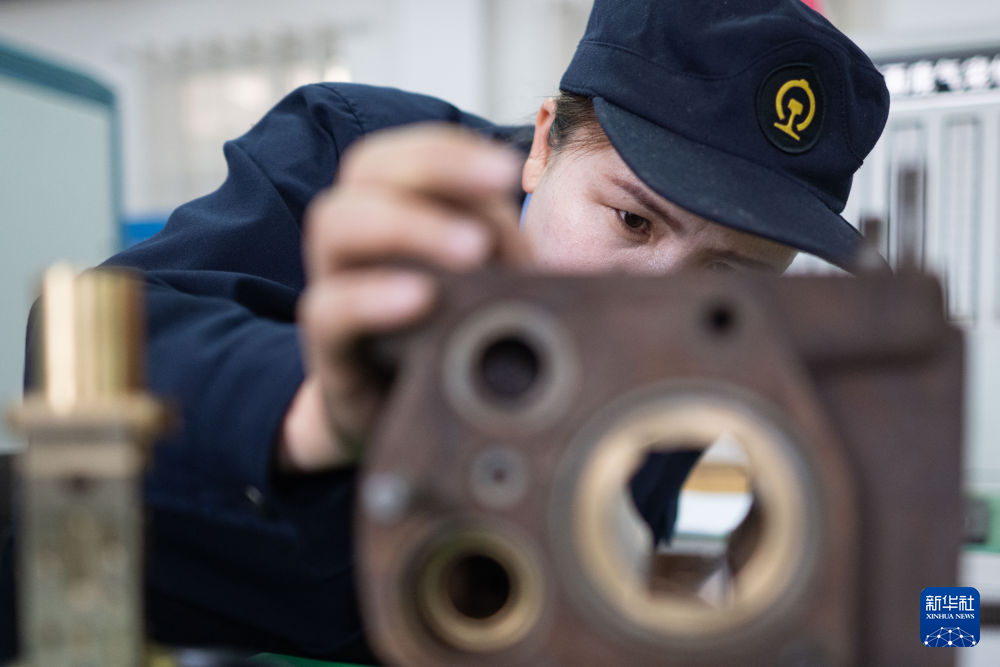 10月12日,在中國鐵路青藏集團(tuán)有限公司西寧東車輛段制動(dòng)班組,馬婷對(duì)120閥滑閥內(nèi)部通路進(jìn)行疏通。新華社記者 張龍 攝