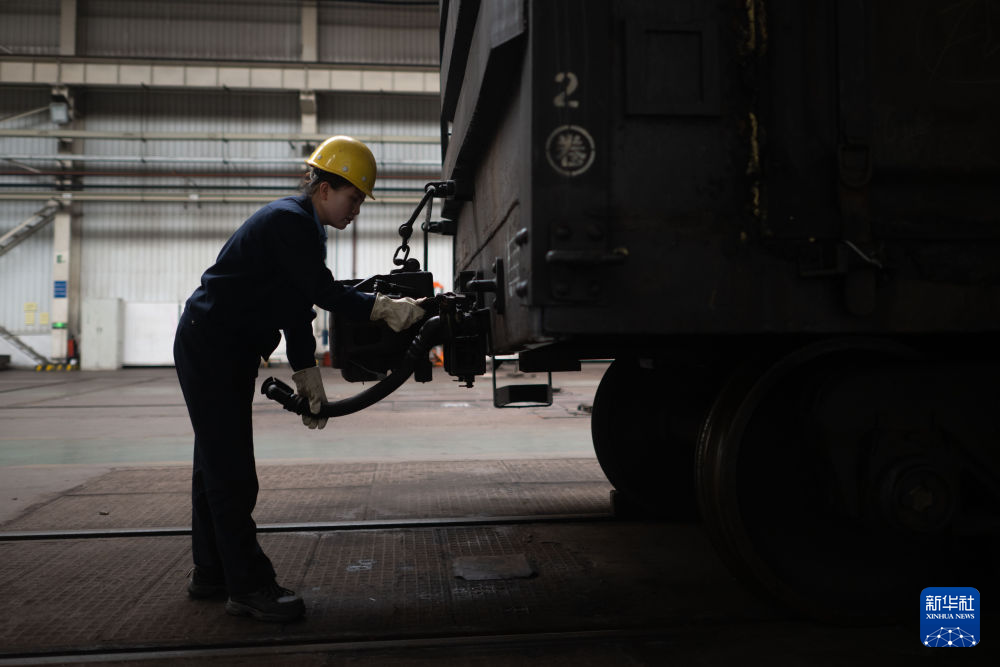 10月12日,在中國鐵路青藏集團(tuán)有限公司西寧東車輛段制動(dòng)班組,馬婷在檢查貨車車輛制動(dòng)軟管。新華社記者 張龍 攝