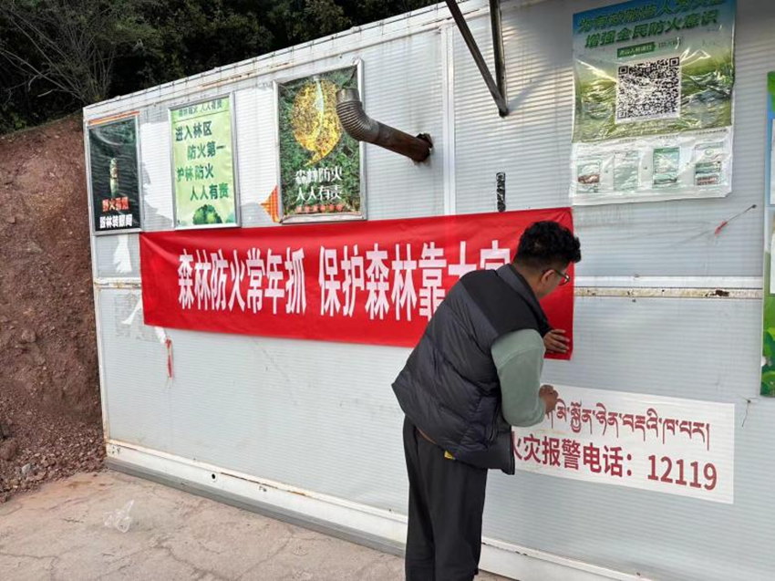 張貼森林防火宣傳標(biāo)語。