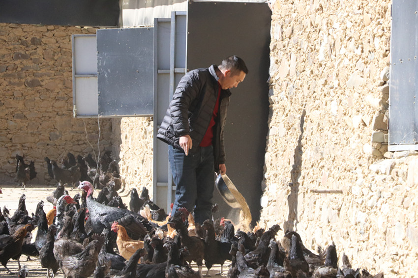 “我們這里的雞都是放養(yǎng),也會(huì)給它們喂一些發(fā)酵后的酒糟、玉米等,這樣養(yǎng)出的藏香雞肉質(zhì)鮮美、緊實(shí),不愁賣不出。雞場(chǎng)常規(guī)存欄量在一萬(wàn)一千羽左右,目前還有7000多羽,其中蛋雞近2000羽?,F(xiàn)在天氣冷,蛋雞每天可以產(chǎn)800到1000枚雞蛋,平時(shí)高峰期,日產(chǎn)蛋基本在1500枚左右?!苯?jīng)過(guò)全身消殺,李厚新帶著我們走進(jìn)位于木拉鎮(zhèn)曲呷村的藏香雞養(yǎng)殖場(chǎng)。