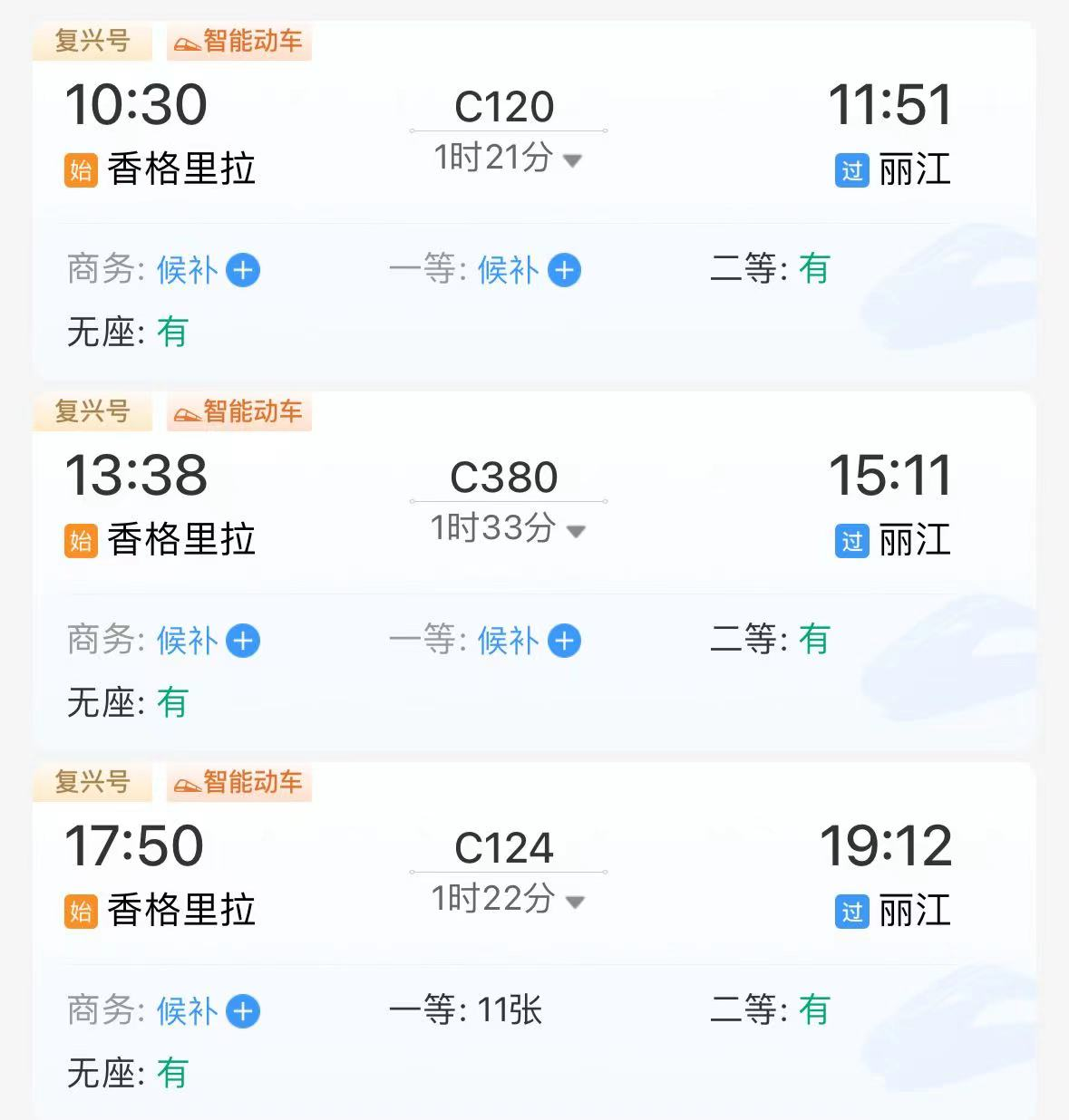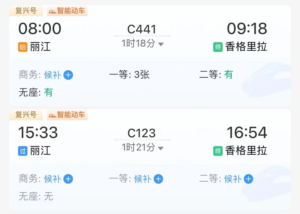 麗香鐵路開通至今熱度較高,鐵路12306購票平臺顯示,多趟班次已出現(xiàn)坐票售罄或無票的情況。根據(jù)香格里拉站工作人員建議,為保證沿線其他車站乘客購票,APP票量實時變動更新,建議買不到票的乘客實時刷新APP,買不到坐票的乘客可以上車后向乘務員詢問各車廂是否有空余座位。