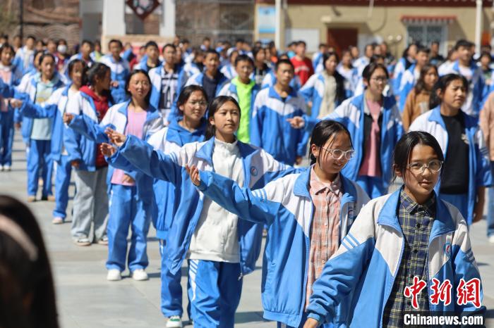 課間操時,呷拉鎮(zhèn)初級中學(xué)的學(xué)生在操場上跳藏族鍋莊舞。王鵬 攝