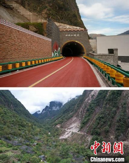 上圖為海螺溝景區(qū)重建的杜鵑林隧道建成后。下圖為建成前的隧道附近受損道路情況。(拼圖)蜀道集團供圖