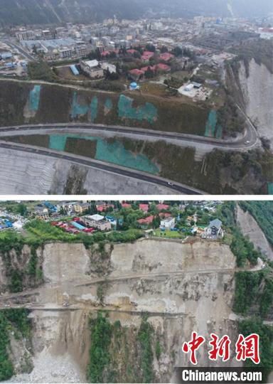 上圖為建成后的絕壁公路。下圖為地震后的絕壁公路受損情況。(拼圖)蜀道集團供圖