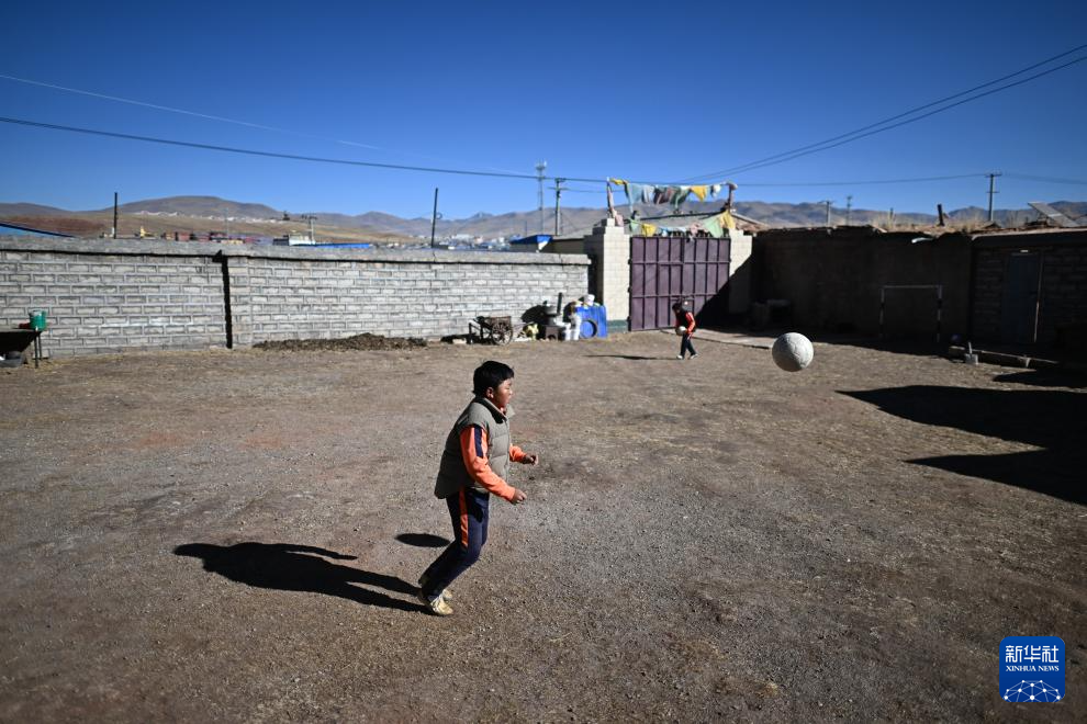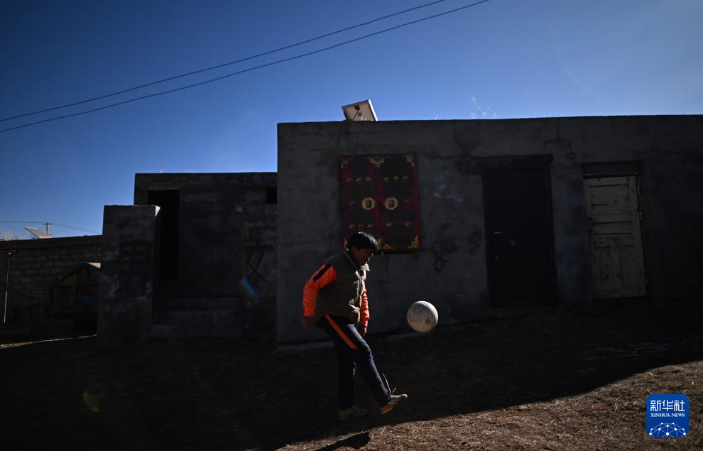 青海玉樹曲麻萊縣約改鎮(zhèn)中心寄宿制學(xué)校學(xué)生悟金唐巧多杰在家中踢球,作為曲麻萊青訓(xùn)隊(duì)一員,他即將前往廣西壯族自治區(qū)北海市參加球隊(duì)冬訓(xùn)(1月12日攝)。新華社記者 張宏祥 攝
