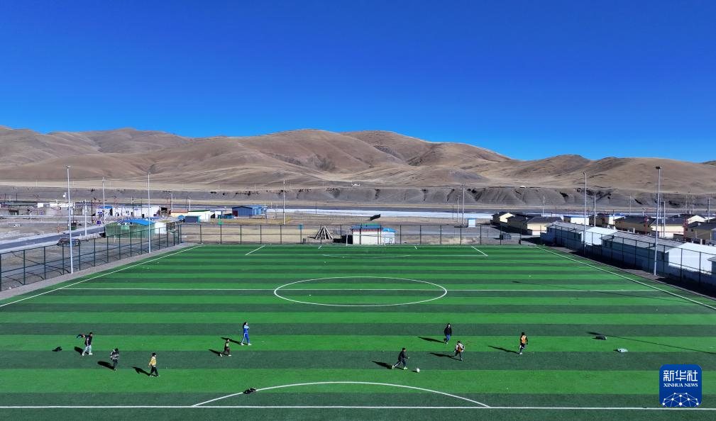 1月12日,孩子們?cè)谇嗪S駱淝槿R縣葉格鄉(xiāng)足球場上踢球(無人機(jī)照片)。新華社記者 韓方方 攝