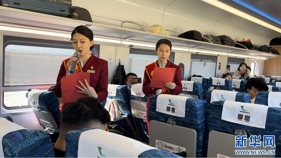 車廂內(nèi),喜慶的燈籠高高掛起,紅色的對(duì)聯(lián)、剪紙點(diǎn)綴其間,濃厚的新年氛圍撲面而來。過道里,乘務(wù)員們的律動(dòng)操、音樂快板、詩朗誦等精彩節(jié)目令人目不暇接,乘客們紛紛拿起手機(jī)拍照錄像記錄。