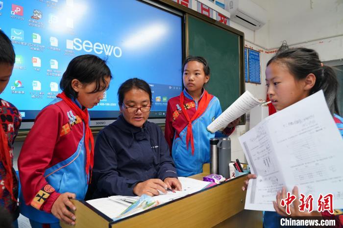 2023年6月20日,德欽縣第一小學的老師為學生輔導作業(yè)。中新社記者 劉冉陽 攝