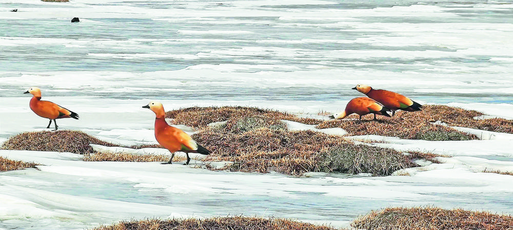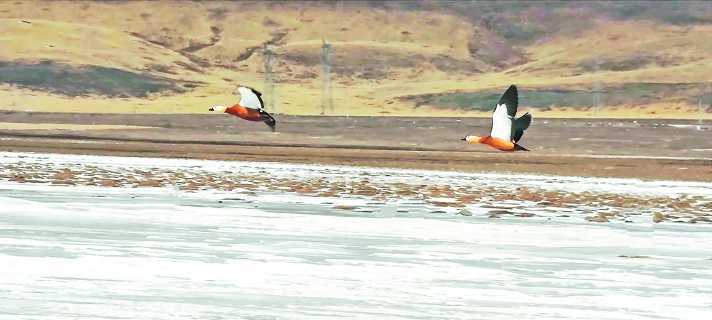 3月8日,青海省玉樹藏族自治州隆寶灘國(guó)際重要濕地迎來(lái)春天首批赤麻鴨12只,身披赤黃褐色的“彩衣”赤麻鴨,或游走在草灘上棲息覓食,或展翅翱翔天空,或在冰面上歇息,讓隆寶灘國(guó)際重要濕地在春季充滿了勃勃生機(jī)。
