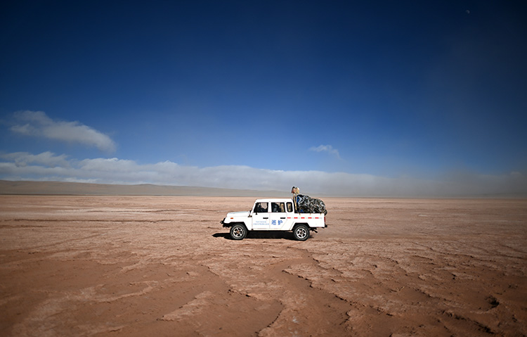 車輛越是深入無人區(qū),空氣中氧氣含量越稀薄,道路越難走。在顛簸近七個(gè)小時(shí)后,記者和巡山隊(duì)員到達(dá)了可可西里中心地帶、重點(diǎn)巡護(hù)區(qū)域——卓乃湖。