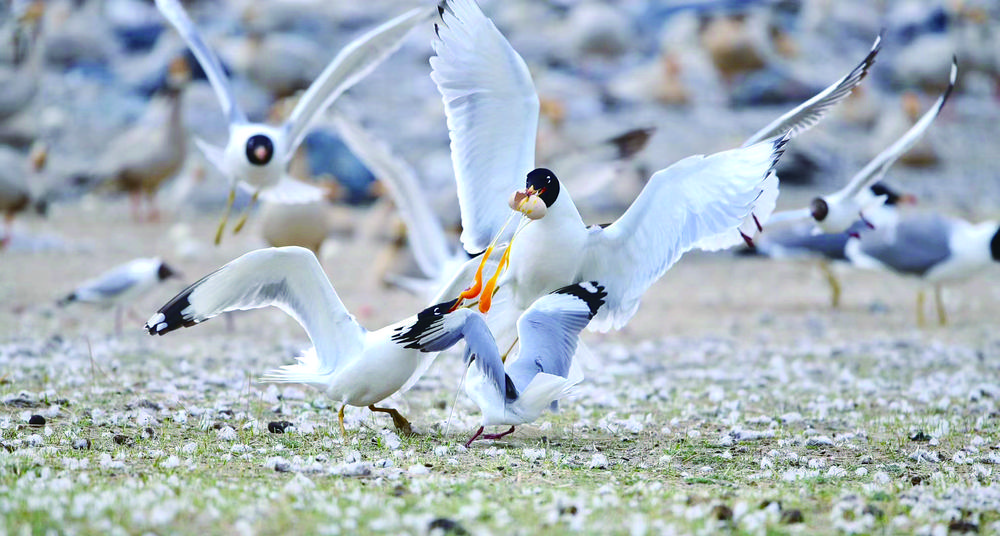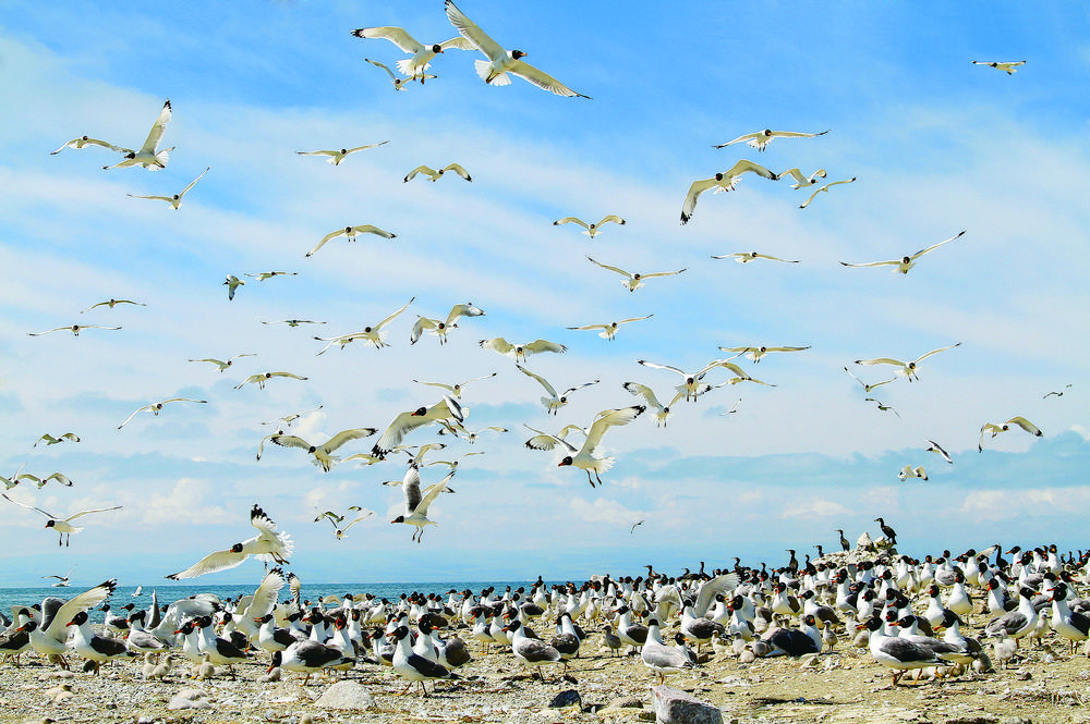 候鳥北歸,青海湖又將進入一年中最美麗的時節(jié)。浮想盛夏時節(jié),棕頭鷗、漁鷗、斑頭雁、普通鸕鶿等水鳥,或成群在低空中擺著“隊形”,或“拖家?guī)Э凇痹谒嫔湘覒蛲嫠#蚝弯в蔚匿音~上演魚鷗“大戰(zhàn)”,碧波蕩漾的青海湖將美得如詩如畫。(本版圖片除署名外,其他均由青海湖景區(qū)保護利用管理局提供)