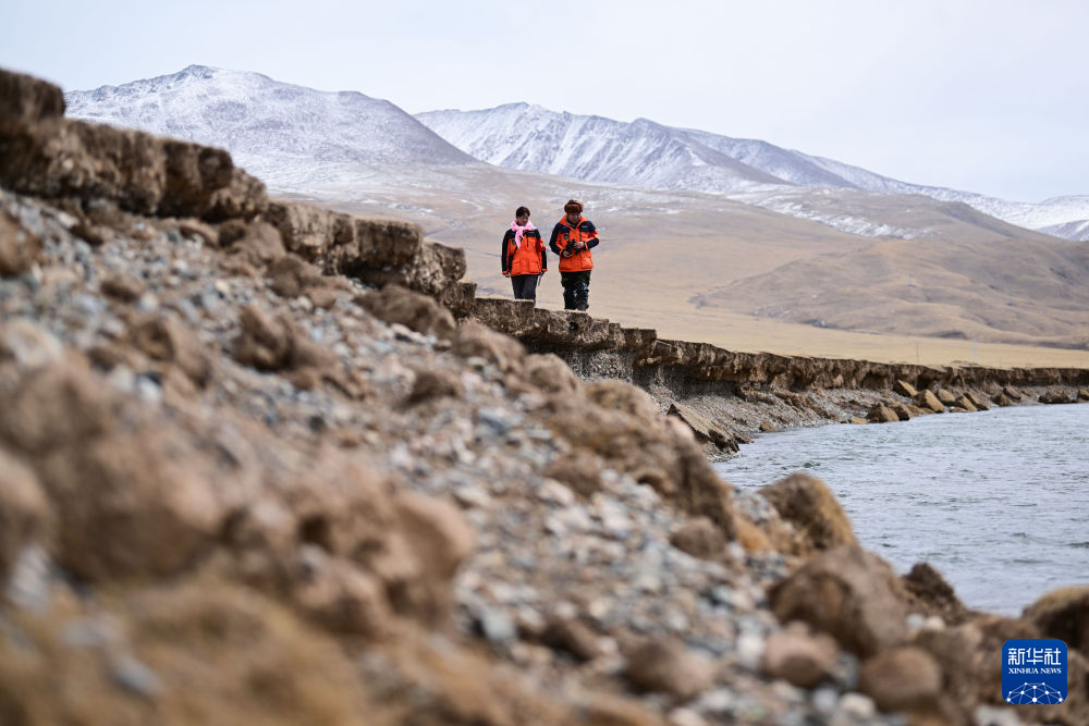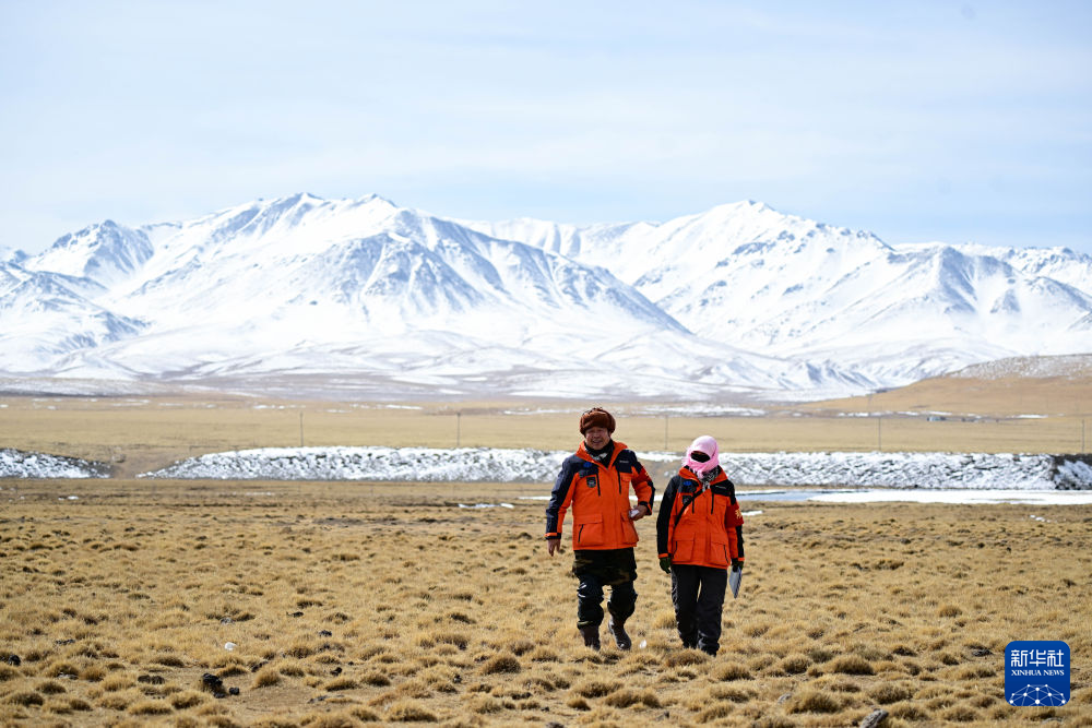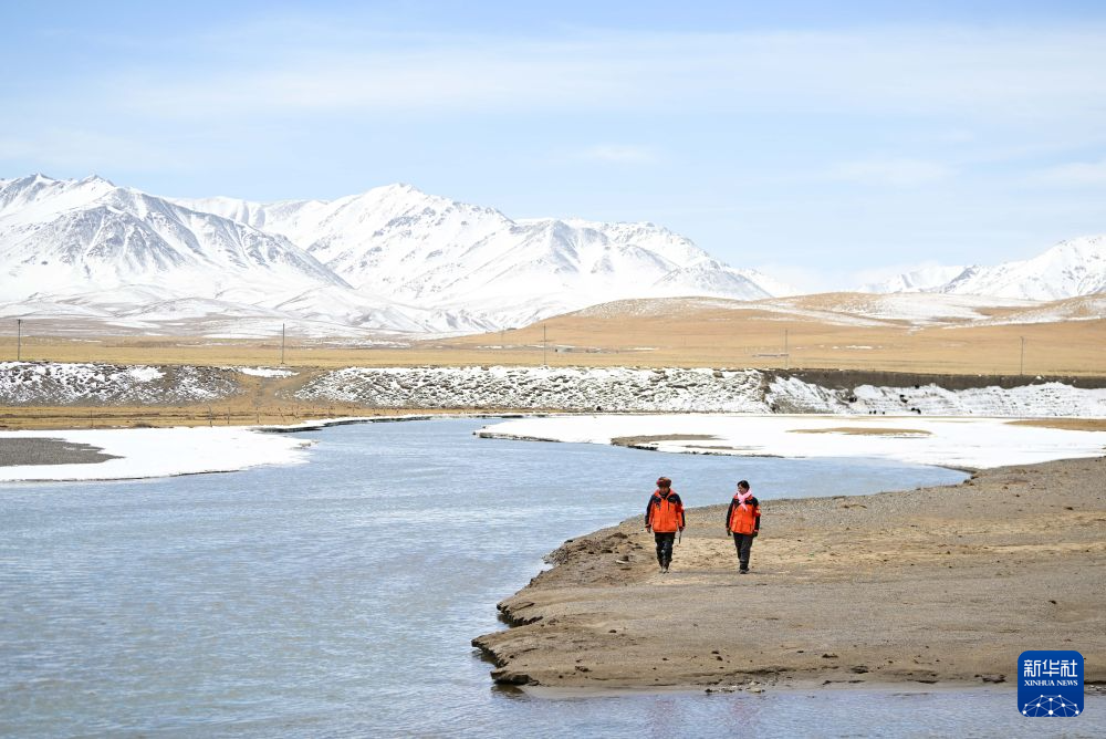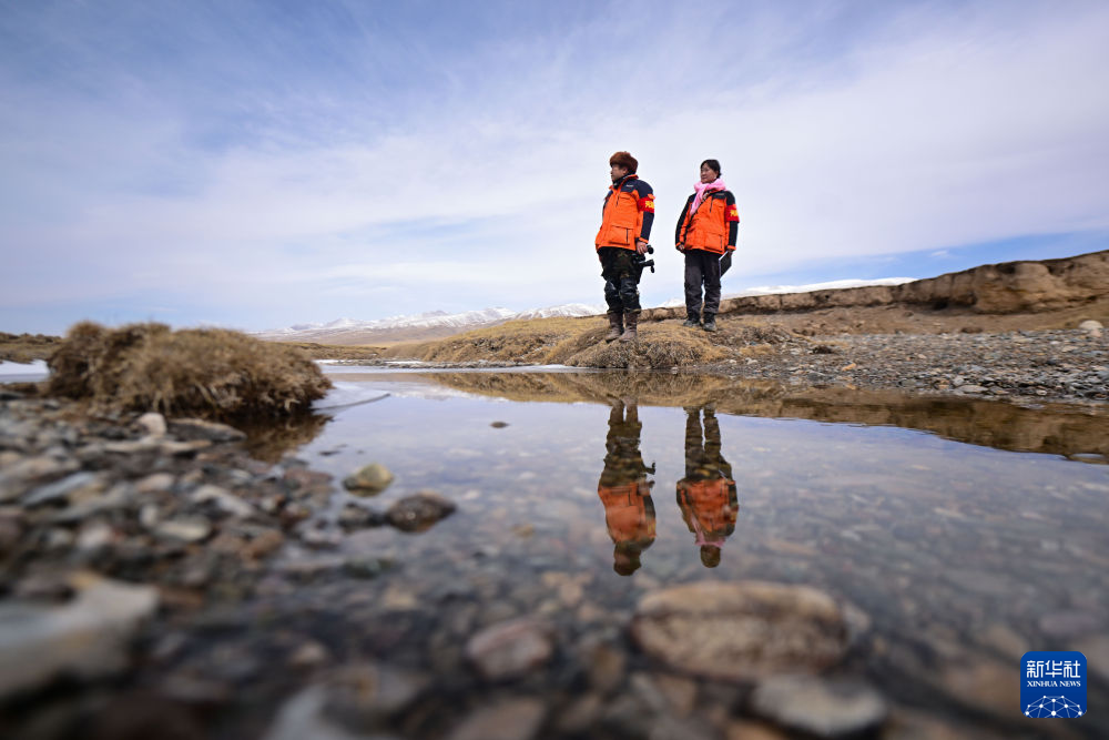 3月21日,葉金俄日(左)與東木措在青海省海北藏族自治州祁連縣的黑河流域巡護。新華社記者 張龍 攝