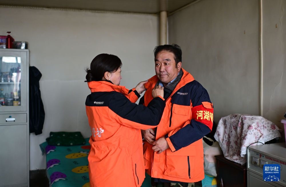 3月21日,葉金俄日(右)與妻子東木措在巡護前整理衣服。新華社記者 耿輝凰 攝
