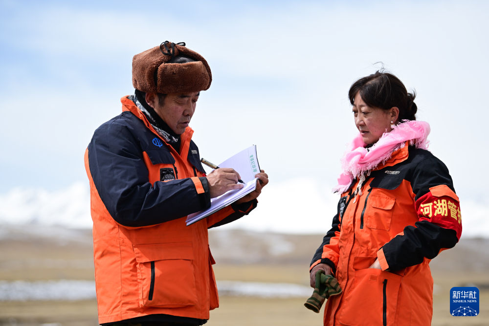 3月21日,葉金俄日(左)與妻子東木措在青海省海北藏族自治州祁連縣的黑河流域記錄巡護日志。新華社記者 耿輝凰 攝