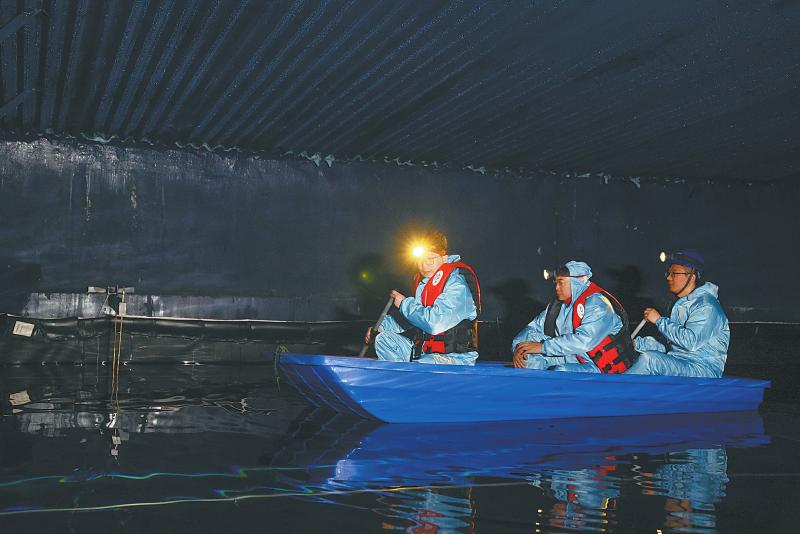 劃著小船進(jìn)入探測器內(nèi)部,體感溫度逐漸降低,這里的濕度超過90%,水溫接近零攝氏度。通過手電筒射出的光柱,隱約看得見大家呼出的白氣,燈光照射之外的區(qū)域就是極致的黑暗。