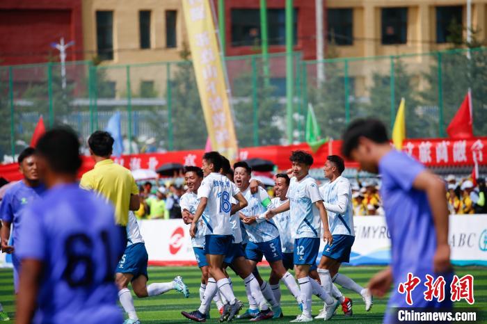 圖為比賽現(xiàn)場,海北祁連山藏羊隊(白衣)慶祝進球。馬銘言 攝