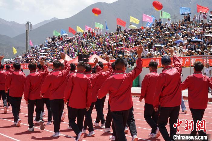 圖為海北祁連山藏羊隊隊員入場和觀眾揮手致意。馬銘言 攝