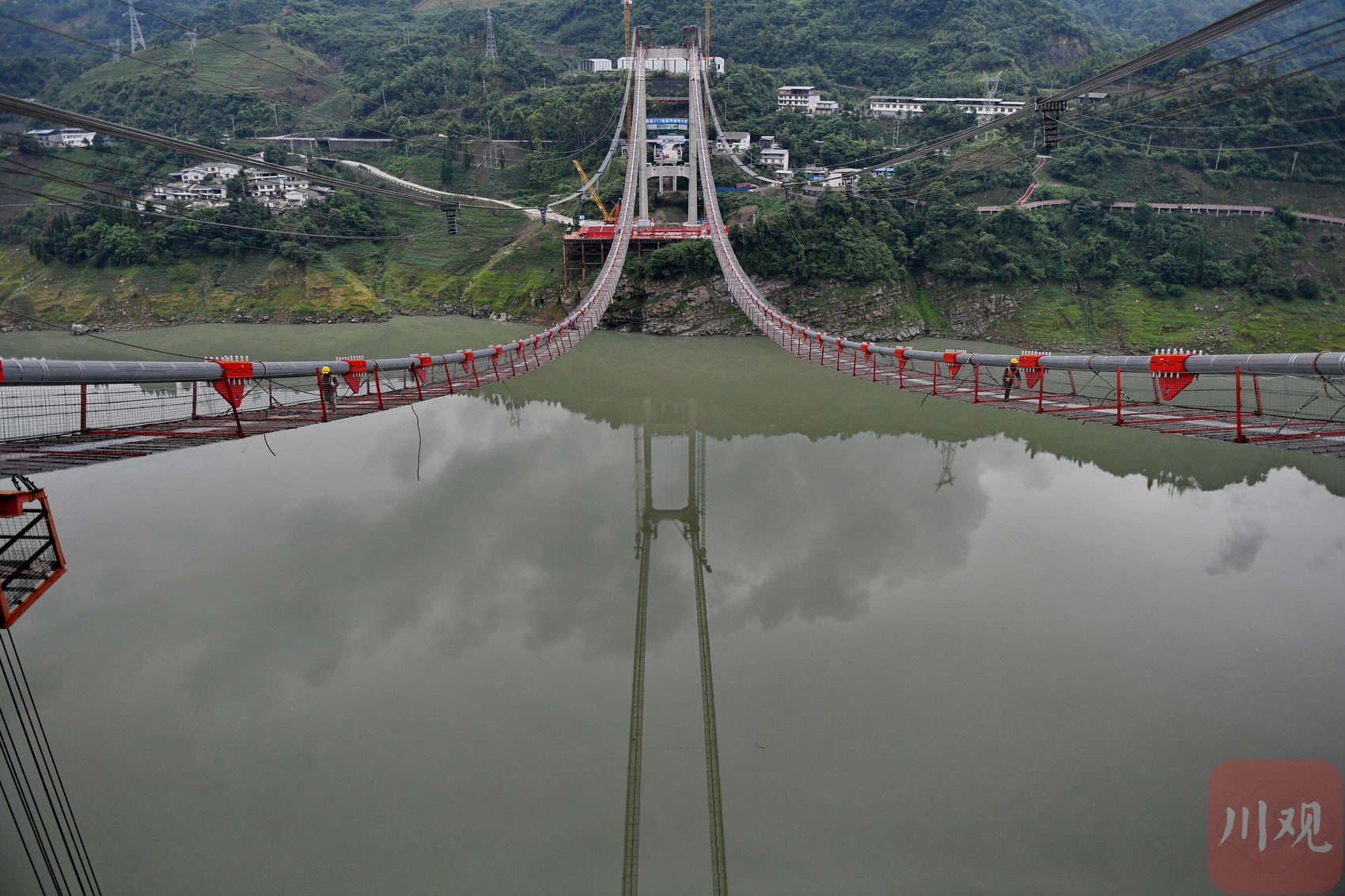 6月18日,阿壩州汶川縣境內(nèi)的國道317線友誼隧道至映秀段改建工程現(xiàn)場,施工人員忙碌在懸索橋主纜上作業(yè)。李向雨 攝