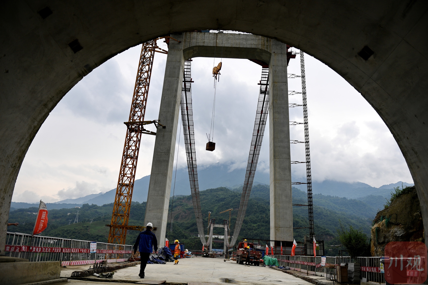 6月18日,阿壩州汶川縣境內(nèi)的國道317線友誼隧道至映秀段改建工程現(xiàn)場,施工人運用塔吊吊運上部結(jié)構(gòu)施工工具。李向雨 攝