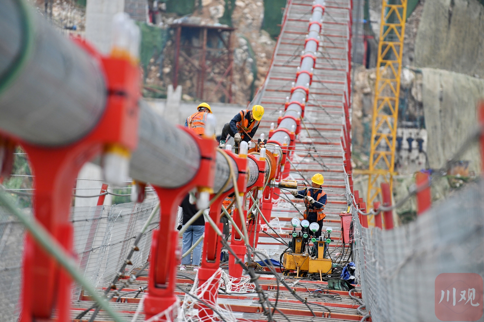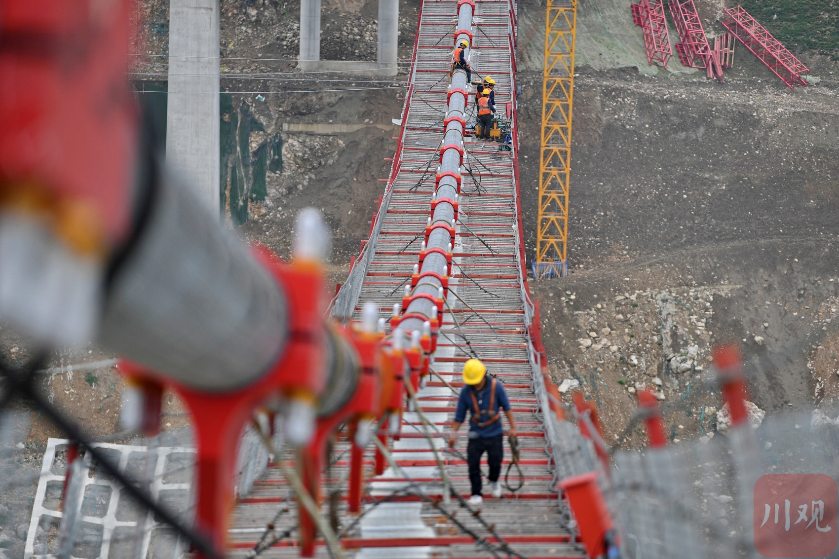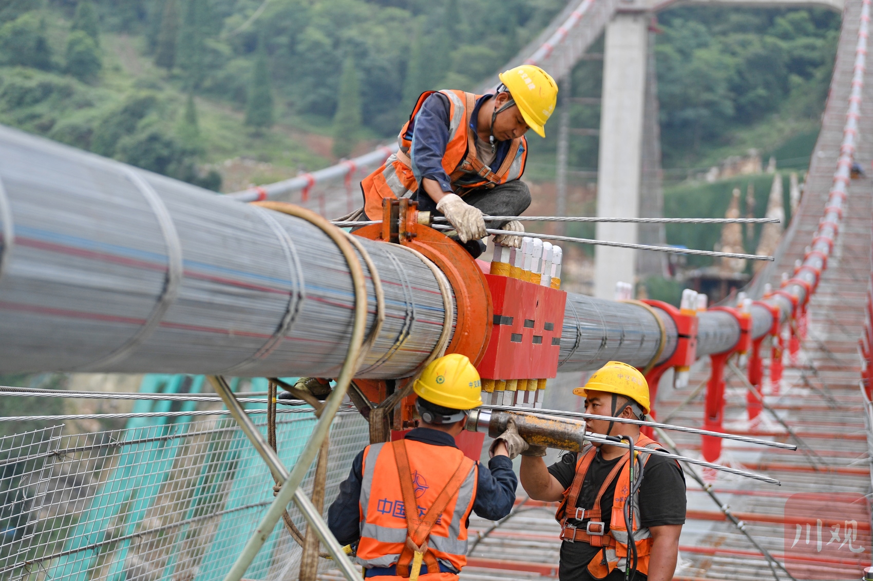 施工人員在懸索橋主纜上作業(yè)。李向雨 攝