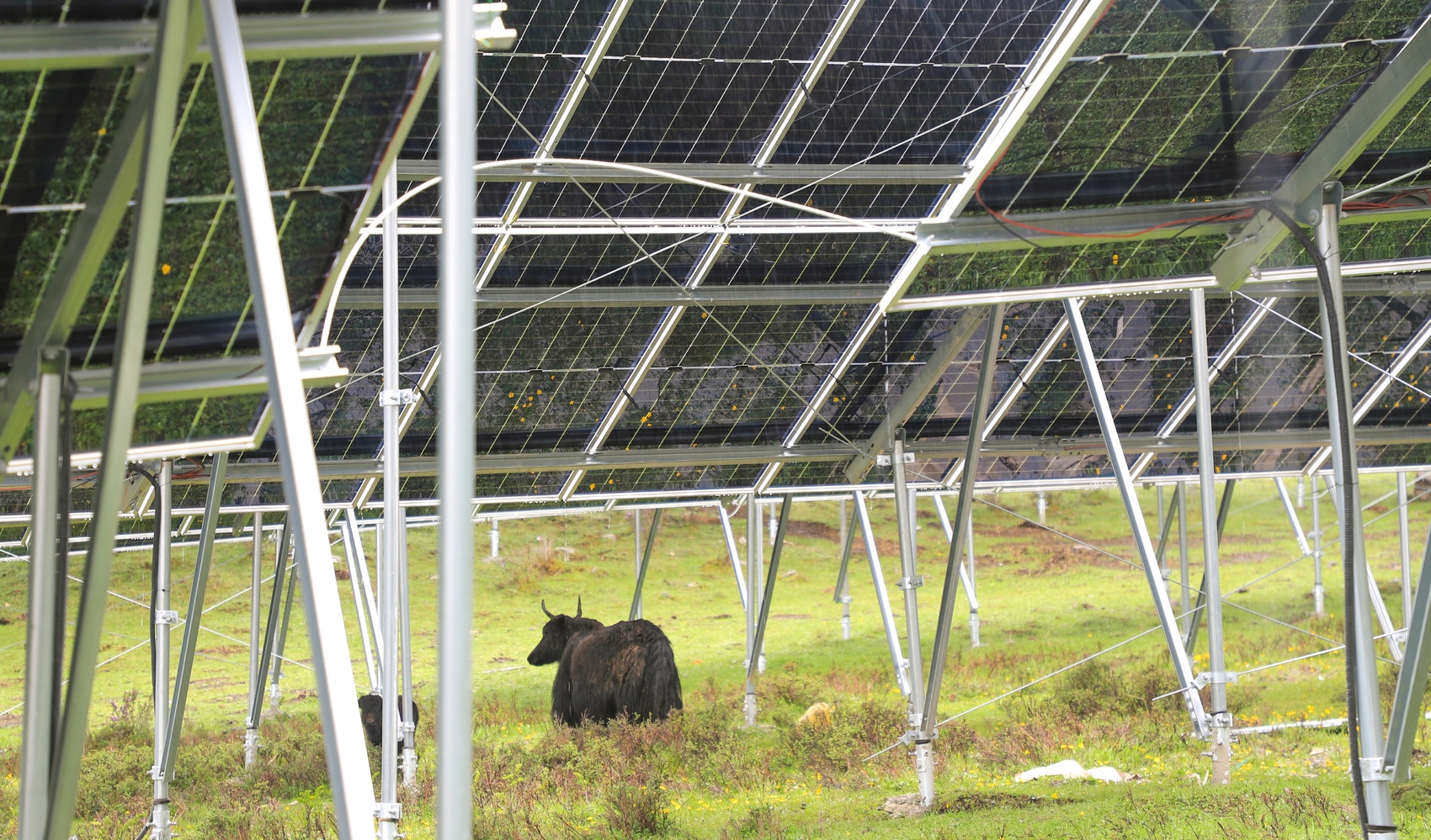為打消顧慮,項目方探索起“牧光互補”模式,即建設(shè)的光伏板不低于地面1.8米,最高處是2.2米,能實現(xiàn)在光伏板上發(fā)電,板下放牦牛,做到“一草兩用,發(fā)展共贏”。同時,項目方還提前一年在基地建了一塊分布式光伏發(fā)電“試驗地”進行驗證。