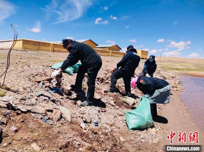 圖為長(zhǎng)江源村生態(tài)管護(hù)員巡護(hù)時(shí)撿拾垃圾。青海省海西州格爾木市委組織部供圖