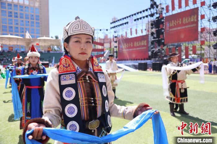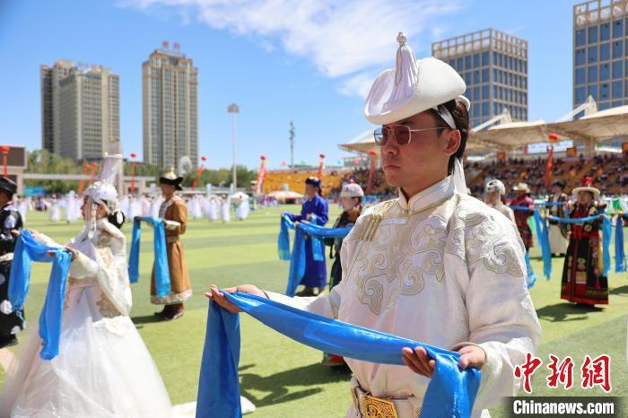 圖為民眾展示蒙古族服飾。中新社記者 張?zhí)砀?攝