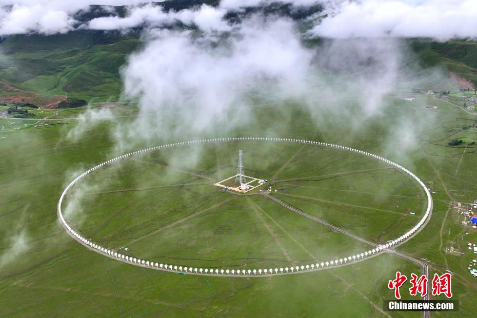 7月22日,四川稻城縣,云霧下的圓環(huán)陣太陽(yáng)射電成像望遠(yuǎn)鏡全景。(無(wú)人機(jī)照片)中新社記者 劉忠俊 攝