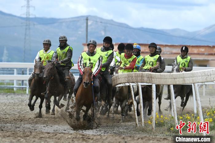 7月30日,四川理塘,比賽現(xiàn)場(chǎng)9號(hào)選手(右一)暫時(shí)領(lǐng)先。中新社記者 劉忠俊 攝